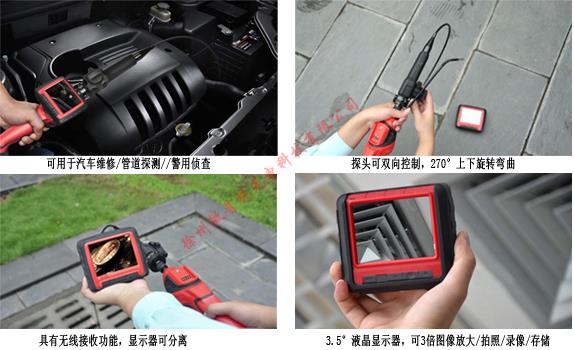 柔性的软管可以进入狭小的空间,无需破拆,降低成本;探头可以两个方向弯曲旋转回看,图像可拍照、录像、放大,工业级手柄坚固耐用;3.5寸液晶显示屏自带电源,可无线接收分离使用。可用于容器、钢瓶、锅炉、汽车维修,小型管道探伤检查。